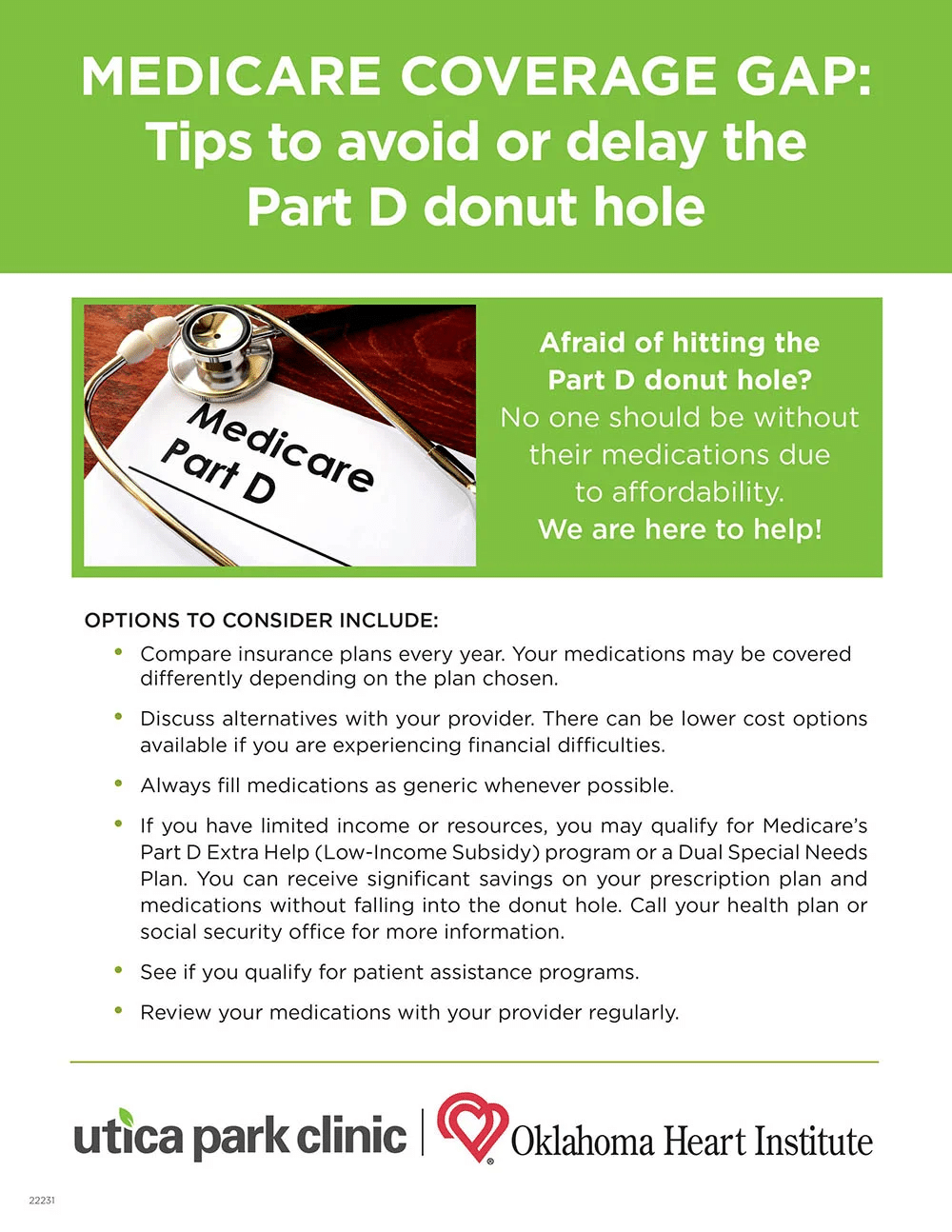 The Medicare Part D “donut hole” or coverage gap is the part of coverage after your initial coverage period. When your total drug costs reach a certain limit, you enter the “donut hole.” Utica Park Clinic and Oklahoma Heart Institute are here to help you avoid the gap! Check out these options.